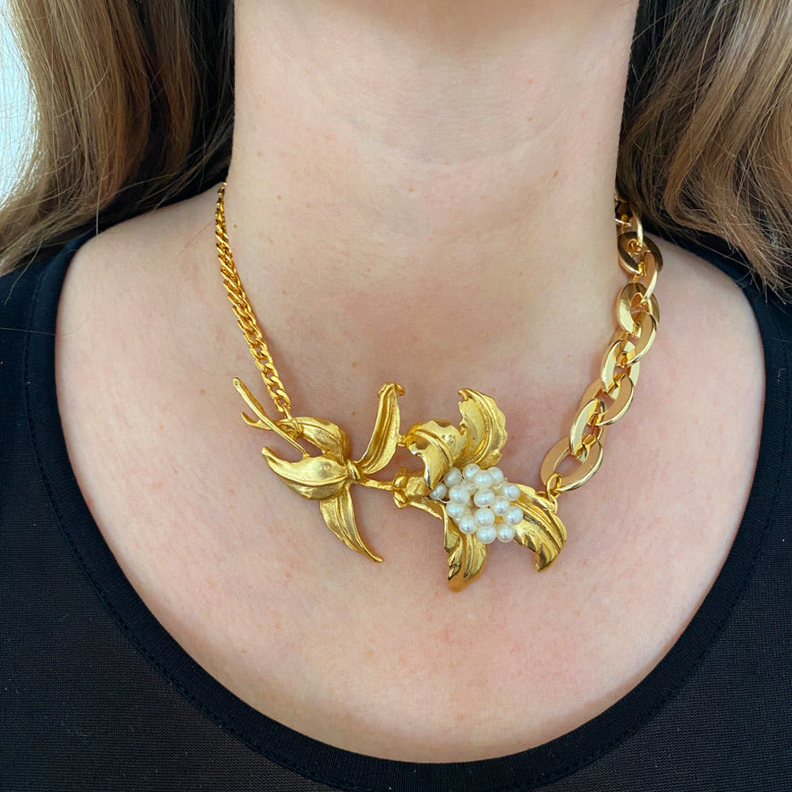 - Double Chaîne Dorée & Pendentif Fleur Au Cœur Nacré